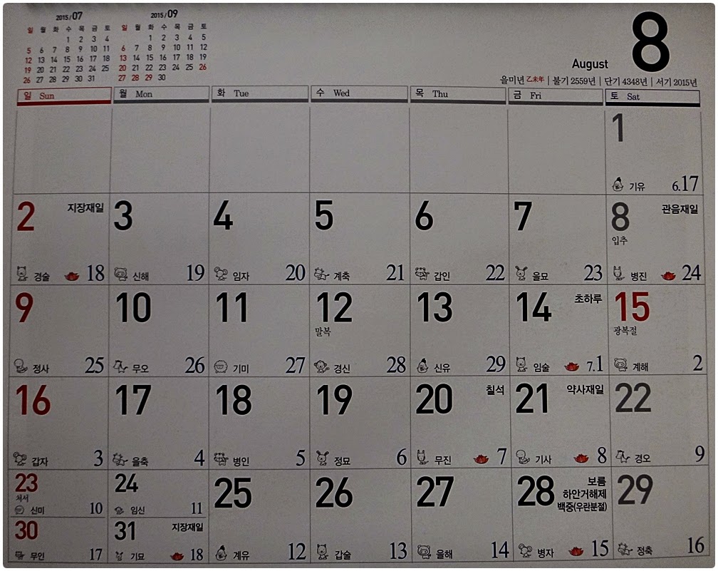 8월휴무일 : 광복절(15) 일요일(2, 9, 16, 23, 30)